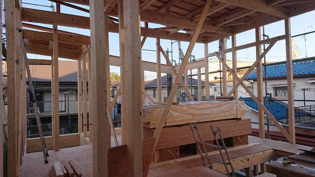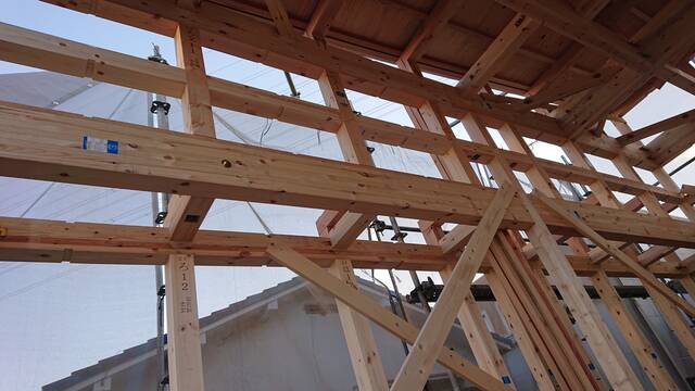 階高を取るために2階の梁の上下が複雑な形になっています。