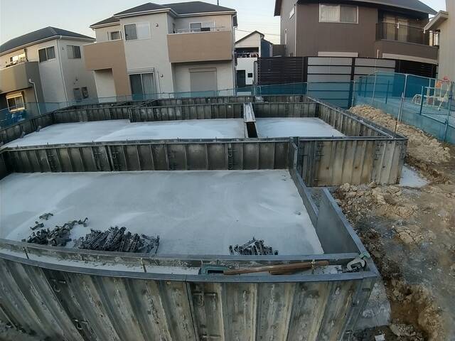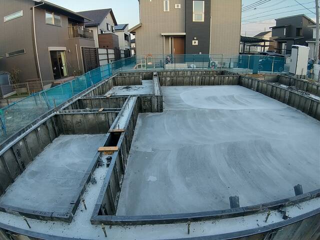 木津川市のK様邸は、土曜日に「土間スラブと立ち上がりの一体構造となるべた基礎」のコンクリートを打設しました。