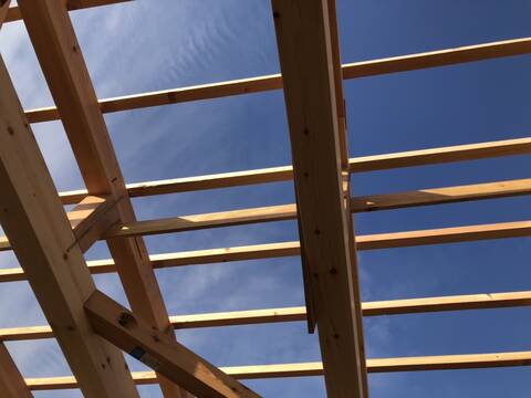 今朝から大工さん7人で作業を行いまして、夕方には予定しておりました屋根下地合板まで作業を終える事が出来ました。