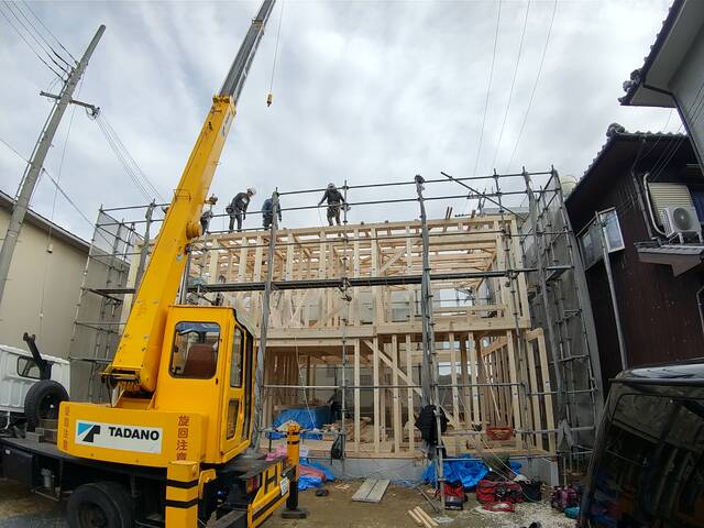 淡路市K様邸は、基礎工事完了後、設備配管、土台伏せ、床下断熱などの準備を経て、本日上棟しました。本日はおめでとうございました!