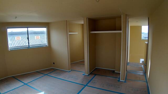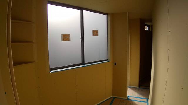 クロスの下地となる石膏ボードが貼られ、埋め込みの枕棚が取り付けられました。