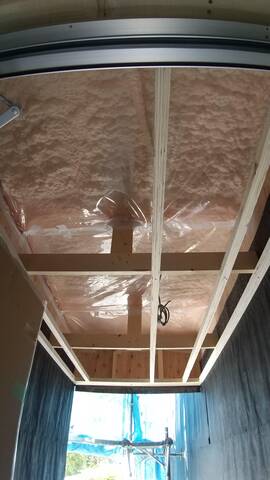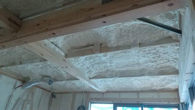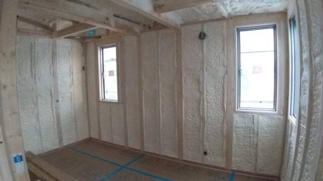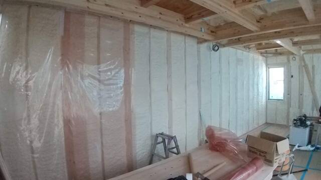 川西市M様邸は、電気工事、設備配管の仕込みも終わり、吹付断熱を行いました。