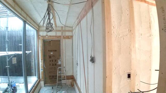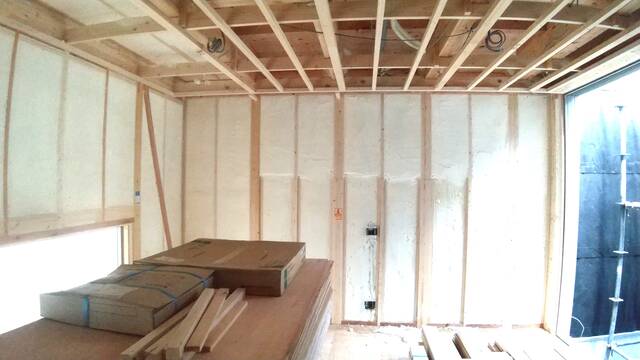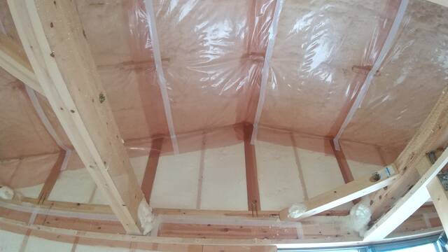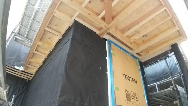 吹付断熱が終わりますと大工工事も折り返し地点となり、外部工事も本格的になってまいります。