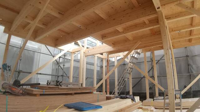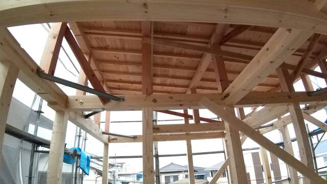 大きなクレーン車で材料を上げ、大工さん達が柱、梁を次々と組んでいきます。