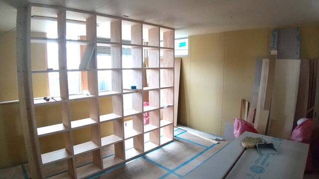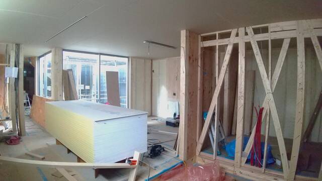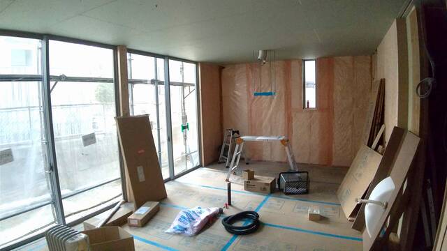 室内は大工造作と並行して、ビニールクロスの下地となる壁の石膏ボード張り進んでいます。