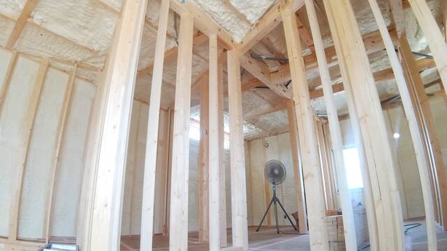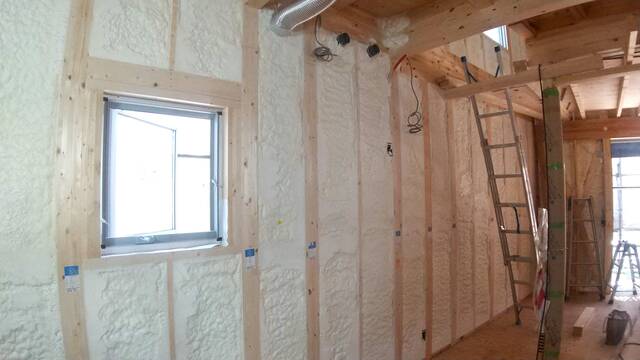 サッシの取り付けが終わり電気配線や設備配管の仕込みをして、吹付断熱を行いました。