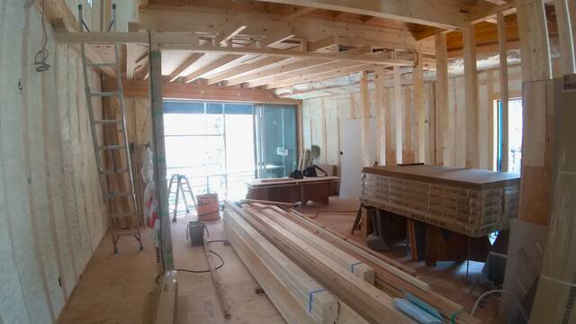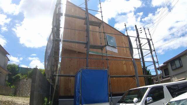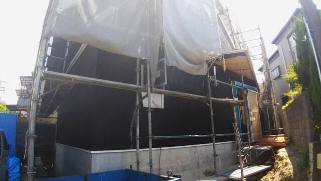 吹付断熱が終わると大工工事も折り返し地点となり、外部工事も本格的になってまいります。