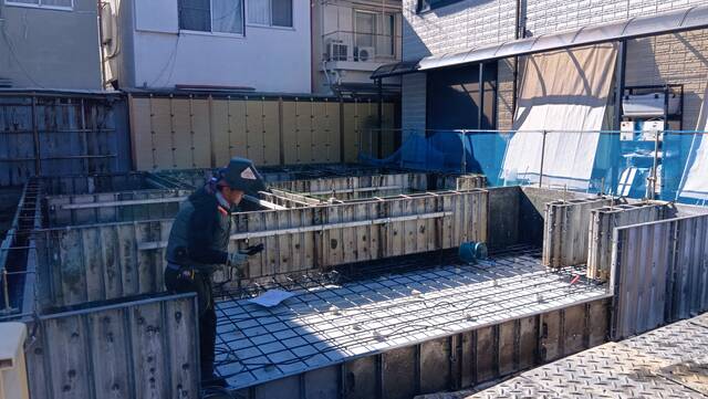 基礎の寸法の墨を出した後に、鉄筋、型枠を組んで準備が進みます。