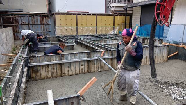 検査を受けたのちに、生コンクリートの打設となります。